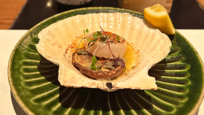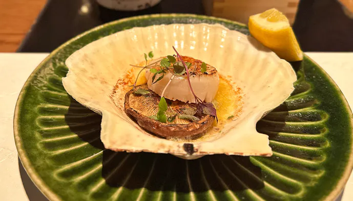 続いての料理は、噴火湾産活ホタテを贅沢に使用した一品。肉厚なホタテを海藻バターでいただきます。濃厚な味わいは、辛口の日本酒とも相性抜群でした。