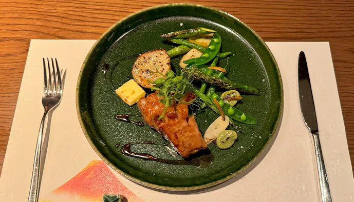 メインは「豊浦産豚ロースと五四〇俱知安じゃがの炭火焼き」。豚ロースは柔らかくジューシー。噛むほどに旨味が溢れ出します。添えられていたのは、540日もの長期熟成をした地元の名産・五四〇俱知安じゃが。ほくほくとした食感に、甘みたっぷりの味わいに驚きました。