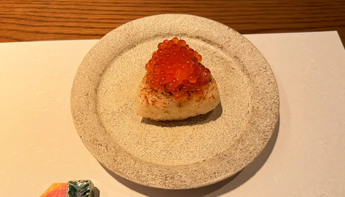 〆には、北海道産のイクラがたっぷり乗った焼きおにぎりが。北海道・蘭越で作られたお米を使用されているそうです。