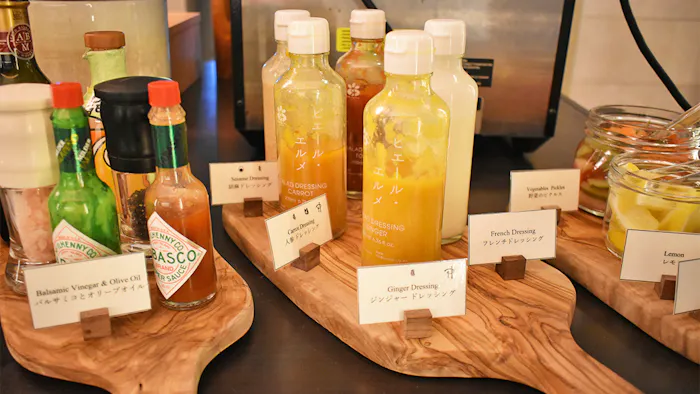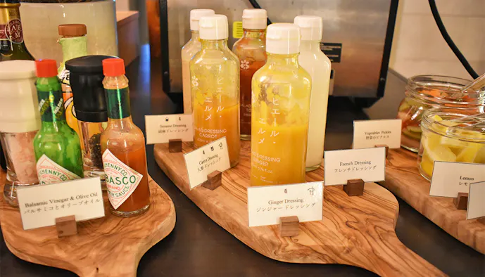 ハムやチーズ、野菜類のコーナー。ドレッシングは「ピエール・エルメ・パリ」のものが5種類も。