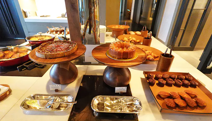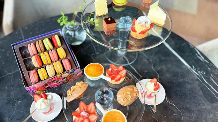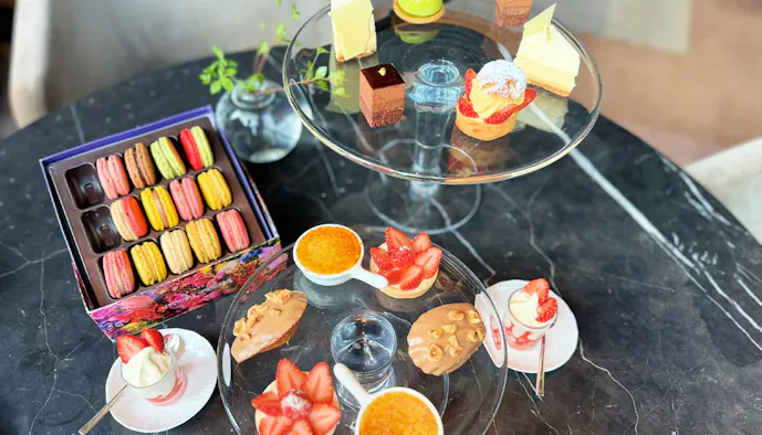 お待ちかね、メインの登場。春らしい華やかなデザートの数々に思わず心がときめきました!シグネチャーテイストのアイテムは、全5種類から好みの3つを選ぶことができます。ほかにも「ピエール・エルメ・パリ」のマカロンから好きな味をチョイスするでき、何とも贅沢。お腹も心も存分に満たされ、最後の最後までラグジュアリーなひとときを満喫しました。