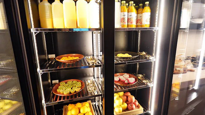 お腹いっぱいでも楽しみたいデザート!冷蔵庫のなかにはフルーツとデザートが用意されていて、朝から幸せな気分です。食後のコーヒーをいただいて朝食は終了。開放感たっぷりの空間で、優雅な時間を過ごすことができました。