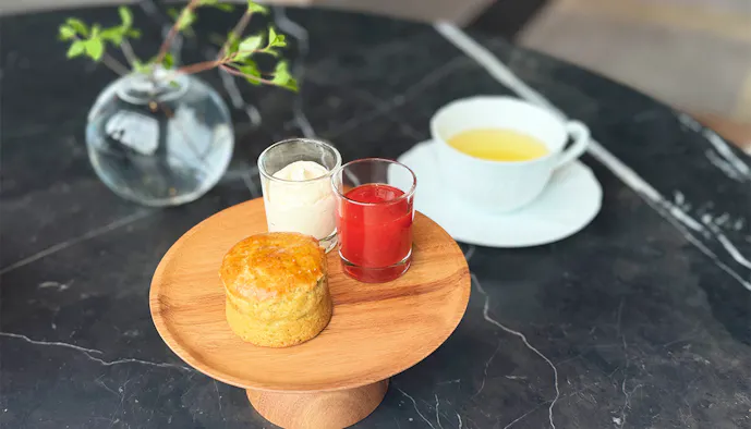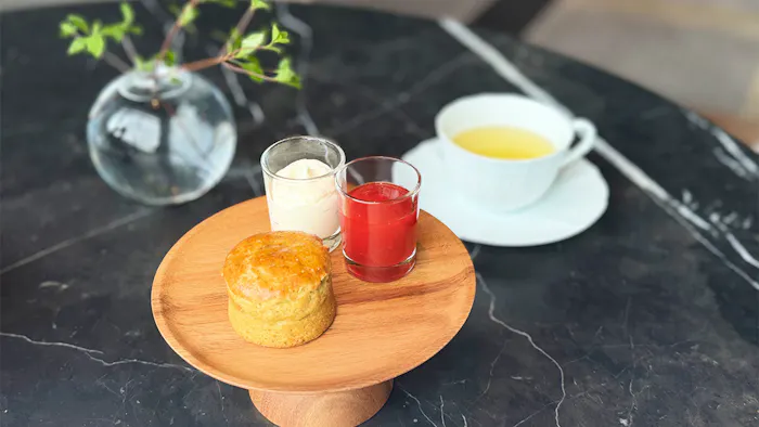 続いてはピスタチオ風味の「スコーン」。自家製のいちごジャムとクリームをたっぷり付けていただきました。甘さ控えめで、柔らかな食感の「スコーン」。程よい大きさであっという間に完食でした。