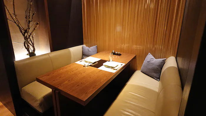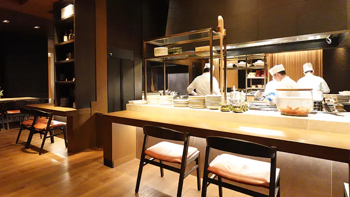 店内にはテーブル席とカウンター席を完備。中央にはオープンキッチンがあり、炉端焼きをはじめ調理の様子を楽しめるなどライブ感たっぷりです。