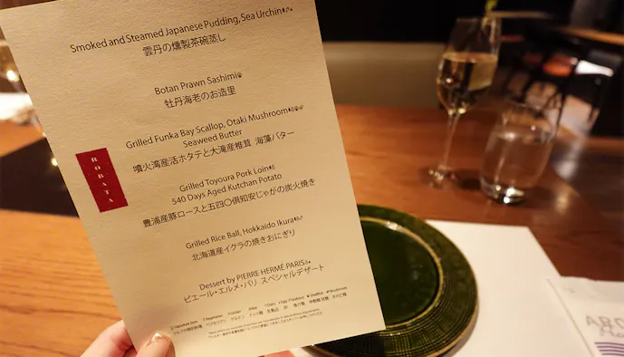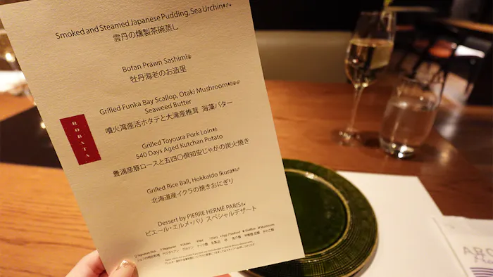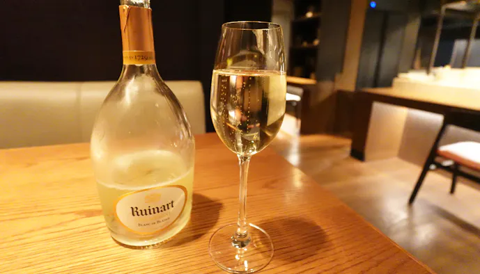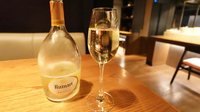 メニューには、北海道ならではの食材名が並び、どんな料理が登場するのか期待に胸が膨らみます。まずは、シャンパン「RUINART(ルイナール)」で乾杯。