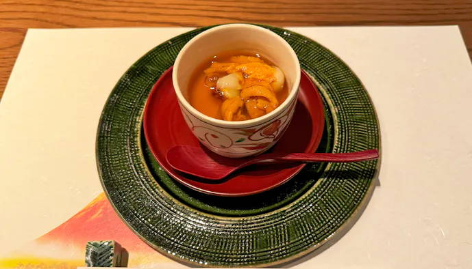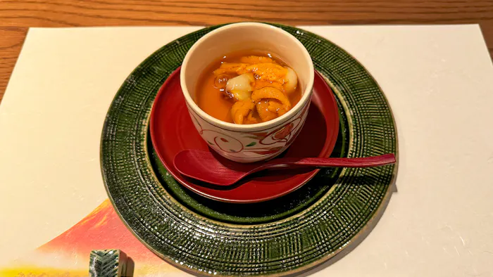 最初にいただいたのは「雲丹の燻製茶碗蒸し」。5月に漁が解禁されたばかりの、北海道産の雲丹をたっぷり使った一品です。濃厚な味わいの餡との相性も抜群。なかには、ほくほくの百合根も入っていて、食感も楽しめました。