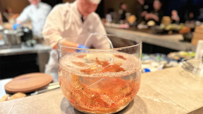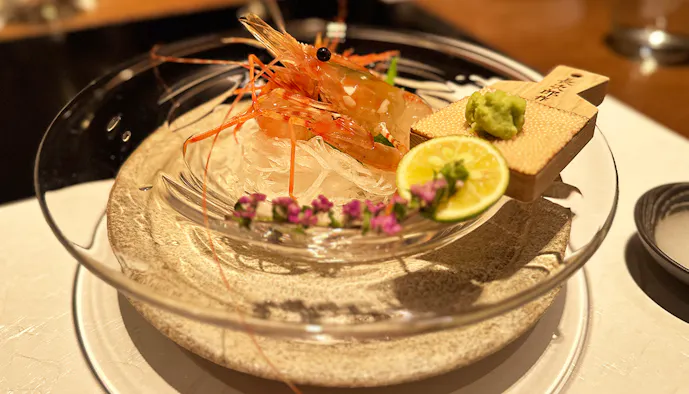 二品目には、生け簀からあげたばかりの「牡丹海老のお造里」をいただきました。席に運ばれたときには、まだ少し動いているくらい新鮮な状態!海老の旨味とぷりぷりの食感がたまらない逸品でした。
