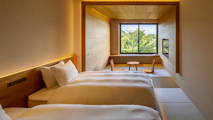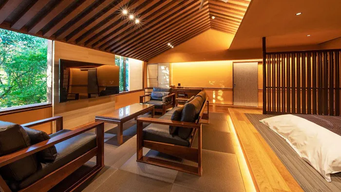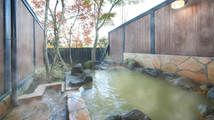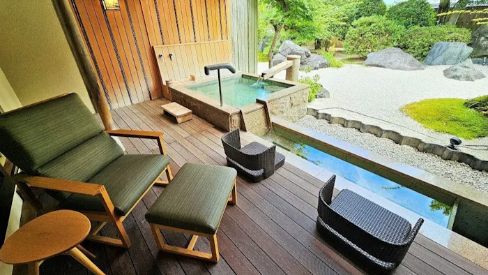 2024年7月には一部客室をリニューアル。「露天風呂・シャワールーム付き客室(ベッド)1F 【椛】」は、16畳の客間に源泉掛け流し露天風呂と足湯、シャワールームが備わるゆとりあるお部屋。整えられた日本庭園と共に、プライベートな湯浴みを満喫してみては。