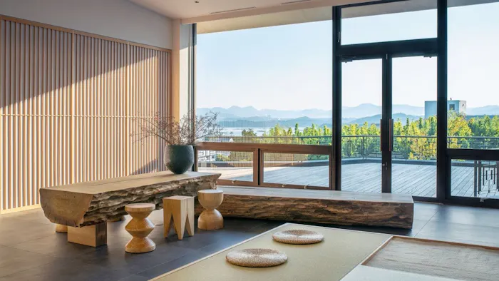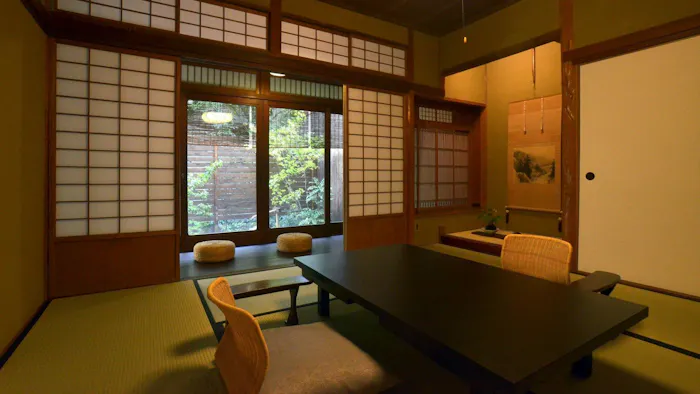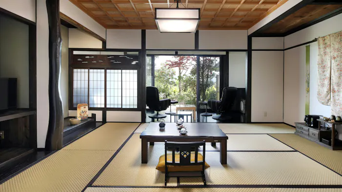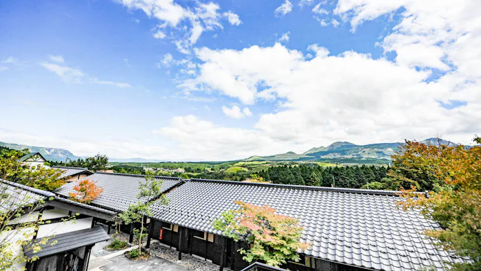 熊本・阿蘇の雄大な自然を眼下に望む、古民家造りの温泉宿「南阿蘇温泉 癒しの里 旅籠 静和」。15室の客室は1棟を2つに分けた長屋タイプと離れのタイプがあり、どちらもプライベート性が保たれた造りになっています。