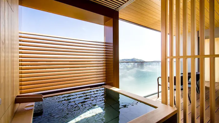 愛媛・道後温泉の「道後御湯」は、「七折梅園」から車で約35分の場所にある温泉旅館。12歳以下は宿泊できない落ち着いた宿で、全ての客室に温泉露天風呂が備わります。「展望浴場」では、一面の大ガラスから「松山城」や街の奥に広がる山々を一望。食事はダイニング「tachibana」にて、愛媛産食材をふんだんに使った創作和食に舌鼓。道後ならではの温泉と美食の饗宴に、日頃の疲れも癒されること請け合い。
