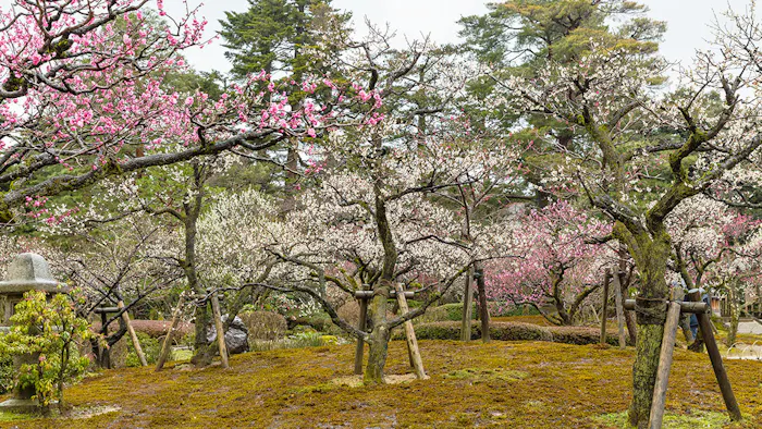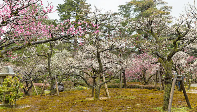 日本三名園のひとつとして知られ、石川・金沢を代表する人気観光スポット。園内には約3,000平米の梅林が広がっています。1969年に、明治百年記念事業で全国の名梅が集められ、約20種200本が植樹されました。紅白の花が咲き誇るのは3月中旬から。しっとりとした風情の日本庭園が、より華やかな趣に包まれます。