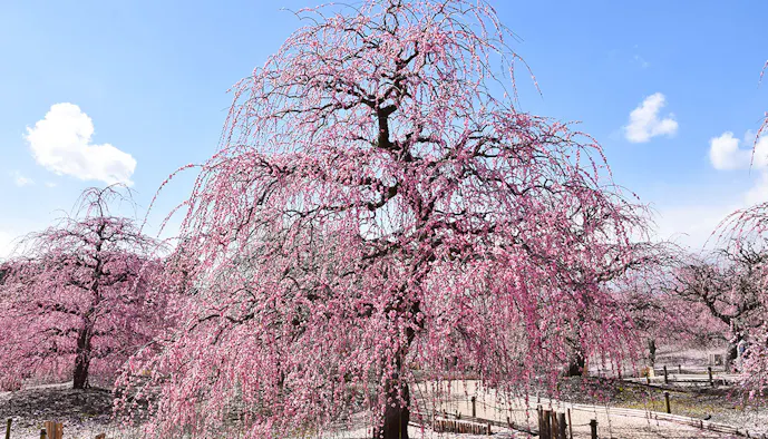 三重・鈴鹿にある「鈴鹿の森庭園」は日本の伝統園芸文化のひとつである、しだれ梅の「仕立て技術」の存続と普及を目的とする研究栽培農園。早春には、しだれ梅の名木が桃色の花を咲かせ、梅の名所として知られています。八重咲きの「呉服(くれは)枝垂」を中心に、約200本の梅の古木・名木を楽しむことができます。桃色の大輪の花を多く咲かせ、大きく美しく艶やかに「枝垂れる姿」は圧巻。