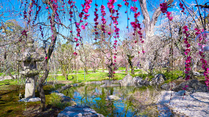 梅の名所として知られている京都の「北野天満宮」。御祭神としてまつられている菅原道真公は、生前梅を愛したという逸話もあり、2万坪の境内には50種約1,500本の梅が植えられているそう。2月上旬頃には梅苑「花の庭」が公開され、白梅、紅梅、一重、八重などの梅の花を展望台から見渡すことが可能。2月25日には「梅花祭」と「梅花祭野点大茶湯」も行われます。