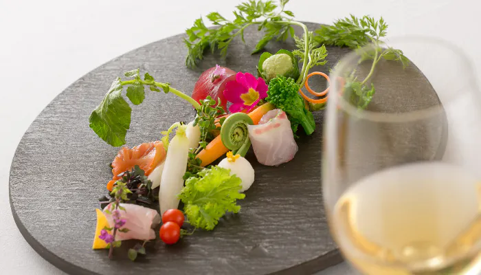 またこの宿では、自社農園や契約農家で栽培した無農薬・無肥料野菜を選ぶなど食事はもちろん、施設の建材も可能な限り自然素材の使用。そんなオーガニックな食材がふんだんに使われた夕食の「おとぎ会席」は、日本の昔話をモチーフとした目にも楽しい品々が並びます。