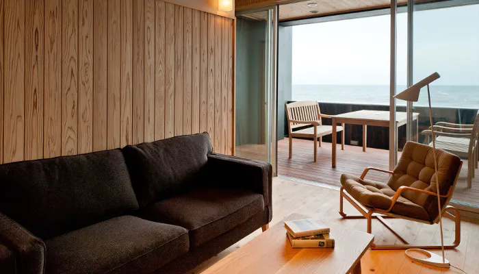 上野駅から約70分。JR水戸駅で電車を乗り換えローカル線の車窓から田園風景を眺めること約15分、「里海邸 金波楼本邸」の最寄り駅、大洗駅に到着します。波打ち際に立つこの宿は、邸内を潮風が通り抜け、現代人がゆっくり「ひとやすみ」するのに相応しい“田舎別荘”のよう。素朴で気負いのない心地よい質感に努め、素足で過ごせる館内には、地元の家具作家による木製のインテリアを各所に設えています。
