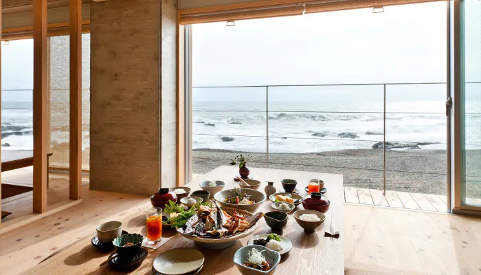 8室ある客室は全てオーシャンフロント。「海辺の風呂」「海辺の食卓」の名の通り、大浴場や食事処もまた迫力のある日本海を感じられる絶好のロケーションです。食卓は掘りごたつ式の桟敷席。打ち寄せる波を目線の高さに見れば、海の近さを改めて感じることができるはず。夜は月明りの下で、朝は水平線から上る日の光の中で、素材を活かした田舎料理をいただきましょう。