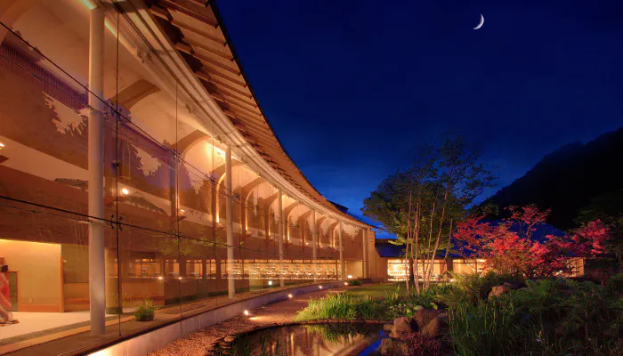 東京駅から約2時間。JR水上駅から宿の送迎バスで約8分の谷川のせせらぎに沿った静かな山間、上信越国立公園内に「別邸 仙寿庵」は位置します。館内は現代建築と伝統技術が融合したデザインを取り入れ、中でも高さ8mのガラス張りの曲面廊下は夜になるとライトアップされ、庭園とともに幻想的な世界を生み出します。