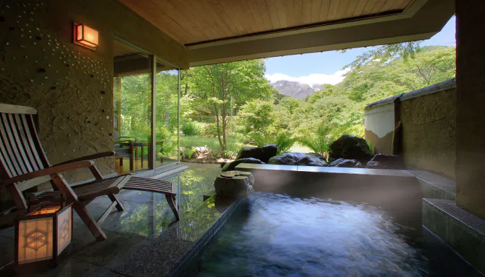 全18室の客室には露天風呂を完備し、室内やお風呂から四季折々に表情を変える中庭や谷川岳の景観を楽しめるのも魅力。この宿が、自然に囲まれているということを改めて感じさせてくれます。2つの大浴場・露天風呂もまた谷川の清流と緑に囲まれ、ゆったりとした空間で源泉掛け流しの温泉に浸かる寛ぎのひとときを過ごせます。客室露天風呂に石の湯、木の湯、趣向の異なる湯船は、どれも味わい深いものばかりです。
