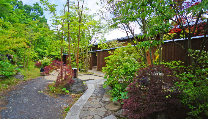 “別天地”を意味する宿名を持つ「湯富里の宿 一壷天」。その名にふさわしく、広大な敷地に一棟建ての離れが点在する様は、まるで別世界に赴いたかのような気持ちにさせてくれます。