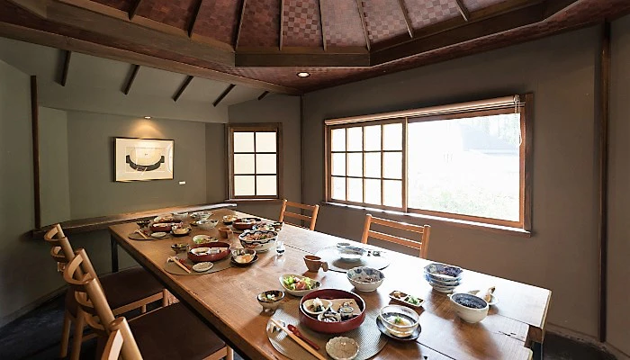 大分の新鮮な素材を使った、和洋折衷のお食事もこの宿の魅力。食べるペースに合わせて提供してくれるメニューの数々は、どれも絶品だと評判です。プライベートが重視された個室ダイニング「壺中居」でいただきましょう。