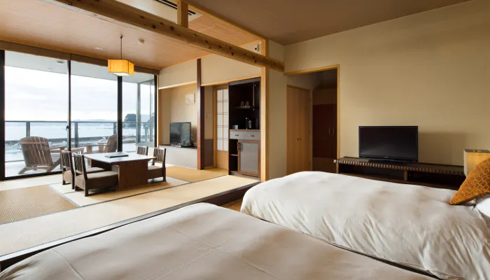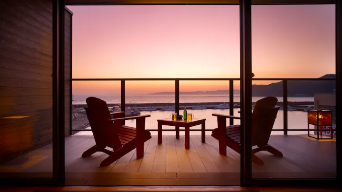 房総ならではの旬の味覚をいただける食事はもちろんのこと、温泉の客室露天風呂もこの宿の魅力。小湊温泉「願満の湯」は、美肌や疲労回復、冷え性などに効能があるとされる天然温泉です。昼間には港の様子や行き交う漁船を眺め、夜には静かな海の遠くに夜景を眺める。何度も入浴したくなる絶景露天風呂をお部屋で楽しむ贅沢な休日となることでしょう。