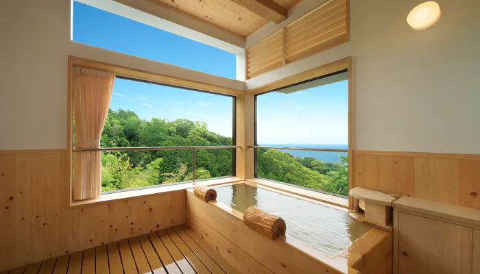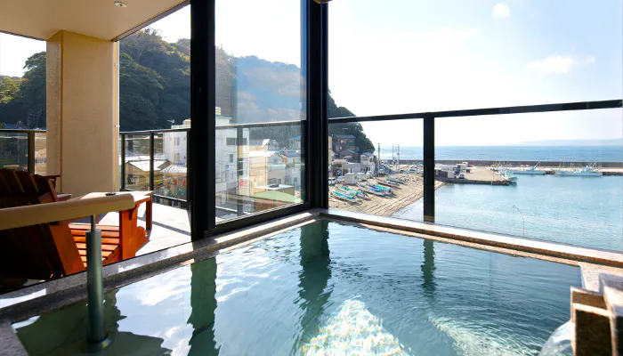 全3室の客室には源泉掛け流しの専用露天風呂を完備。温泉は美肌に良いとされるメタケイ酸を多く含みます。宿の立地から、露天風呂からの眺めは格別。目の前には雄大な相模湾が広がり、初島にまで手が届くかのよう。晴れてよく空気が澄んだ日には、房総半島までも見えるのだとか。古民家×絶景露天風呂のコラボレーションを楽しんで。