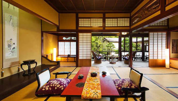 日本三大名湯の一つとして知られる石川県山中温泉。北陸随一の渓谷美を誇る鶴仙渓中流に架かる「あやとりはし」のほど近くに「山中温泉 胡蝶」は位置します。豊かな自然に囲まれた書院造の建物は、広大かつ風雅な日本庭園を有し、古き良き日本の情緒と歴史を感じる佇まい。全10室の客室もまた、花鳥風月をテーマとし、随所に日本の粋が施されています。