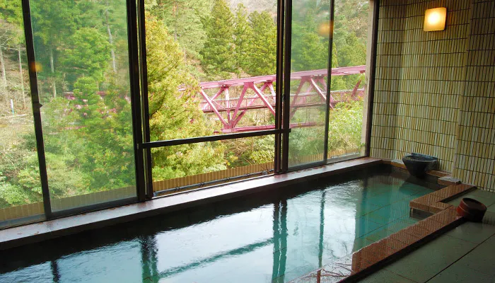 開湯1300年、歴史ある山中温泉の魅力を最大限に引き出すロケーションが自慢の大浴場。内湯から庭園風露天風呂へと続く「月かげの湯」と、名勝・鶴仙渓とあやとりはしの景観や四季の趣を感じられる「川かぜの湯」は、時間による男女入れ替え制でどちらも楽しめます。他にも、渓谷に面し、窓を開ければ露天風呂にもなる貸切風呂は、空いていれば予約なしでいつでも利用可能。美しい景色とともに、名湯に癒されましょう。