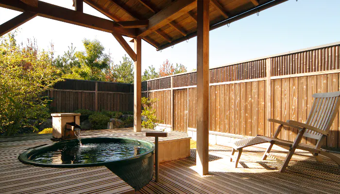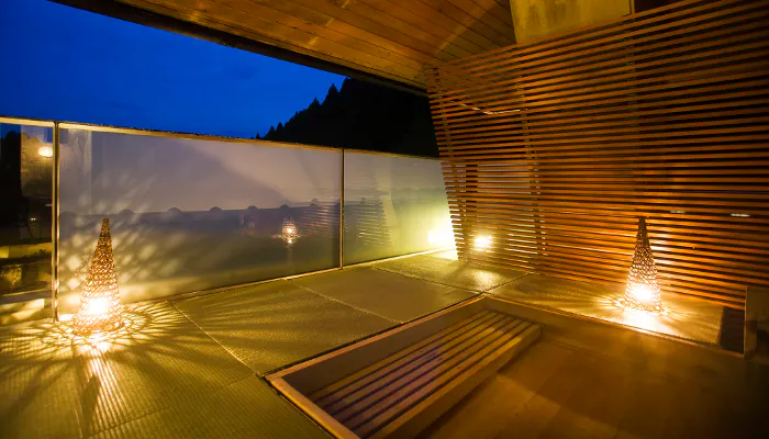 戸室石に少しずつろ過され100年の時を越えて湧き出した湯涌温泉は、無色・無味・無臭で、きめ細かいのが特徴。湯治の湯として多くの人々に親しまれてきました。最上階にある露天風呂では、湯涌の街並みや緑の山々を眺めながら、地から湧きだす温泉に浸かりましょう。とことんプライベートな時間を過ごすなら、旅館には珍しいメゾネットタイプの温泉露天風呂付客室へ。贅他なおこもりステイが叶います。