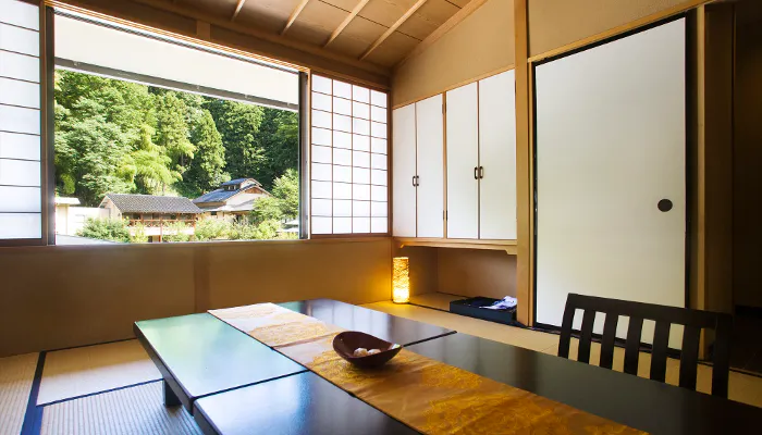 山側の和室「きゃら」は、通常の客室に比べて天井が高く梁がむき出しになっており、古民家の名残りを特に感じることができるお部屋です。日本海の荒波や、水平線に並ぶ漁火を見ることができる越前海岸側の客室では、タイミングが合えば、お部屋で夕食をいただきながら日本海に沈む夕日を拝めることも。古民家ならではの趣深い木の温もりによる癒しの空間で、越前の味覚をお腹いっぱいいただきましょう。