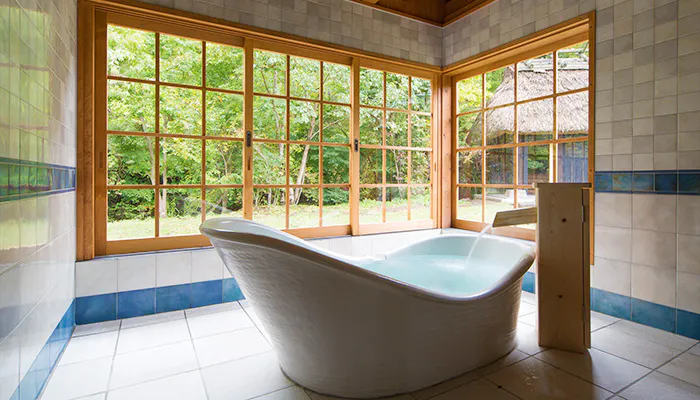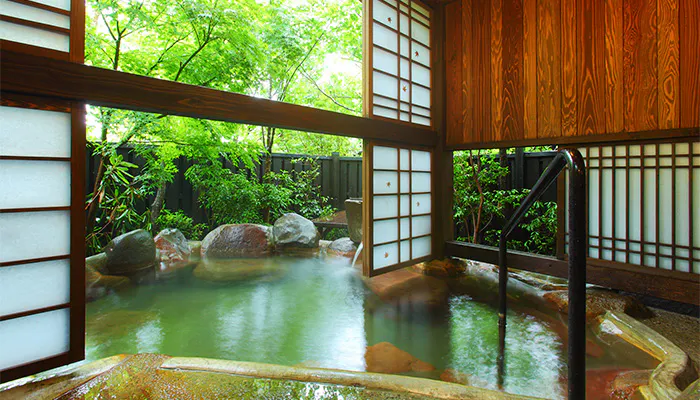 洋の特別室では、タイル貼りされた壁面がかわいい内湯や、野趣あふれる外湯の両方で温泉に浸かれるという特別な贅沢を味わえます。大きなガラス窓から見える色濃い自然に、心洗われる思いをすることでしょう。