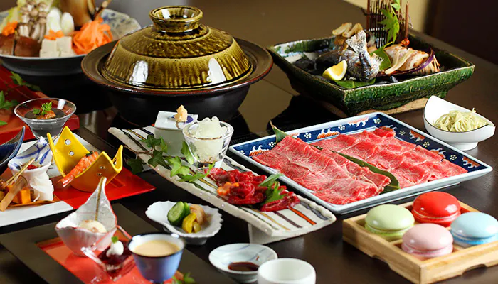 「深山山荘」では、ゲストが自分本位に過ごせるよう宿泊と食事は別々に考える「泊食分離」のスタイルを採用しています。宿から足を伸ばして食事を楽しむのもいい思い出ですが、宿自慢の「みやまダイニング 畔」もとっても魅惑的。黒毛和牛やりんどう豚のしゃぶしゃぶ、地元名物の馬刺し料理など、お好きなメニューを自在にチョイスして心ゆくまで旅先の贅を満喫しましょう。
