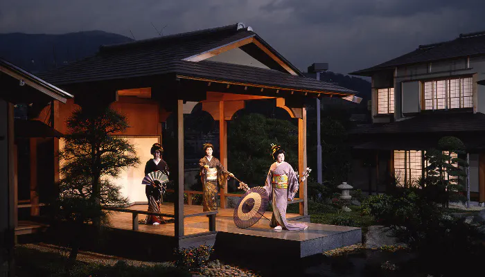 庭園を囲むように数寄屋造りの離れが並び立つ「あたみ石亭別邸 桜岡茶寮」。夜になるとライトアップされる、敷地内の能舞台が幻想的な雰囲気を演出します。毎週金・土曜日には、熱海芸妓の舞を間近で鑑賞することもできるので、つかの間の非日常体験を味わってみてはいかがでしょうか。(修繕工事のため、2021年7月末まで休止中)