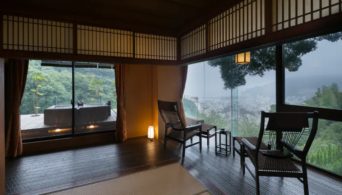 客室露天風呂に浸かれば、目線の先には温泉街の景観と美しい竹林の眺めが。どこにいても熱海の絶景を満喫できる空間で、大人だけの落ち着いたひとときを過ごしてみては。