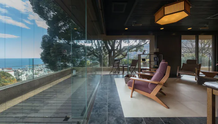熱海の市街地を一望する高台に建つ「WA亭 風こみち」は、宿泊を13歳以上に限定した宿。落ち着いた雰囲気のエントランスをくぐって館内に足を踏み入れると、一面のガラス窓の向こうに大パノラマの絶景が広がります。ロビーラウンジではウェルカムドリンクの他、滞在中にフリーでいただける飲み物の用意も。景色を望むように配された椅子に腰掛けて一息つきながら、日常では出会うことのない光景に癒されましょう。