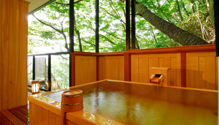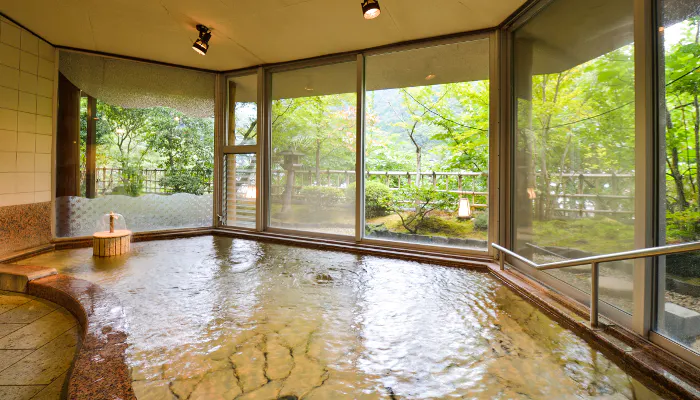 箱根連山を望む展望大浴場は、広く取ったガラス窓により、まるで露天風呂のような開放感です。箱根七湯の中で最も古い箱根湯本温泉。自家源泉掛け流しの温泉は塩化物・硫酸塩温泉です。pH8.4のアルカリ性で、美肌の湯として知られています。伊豆石を使用した「銀殿」と、檜の温もりを感じる「金殿」で心ゆくまで堪能しましょう。