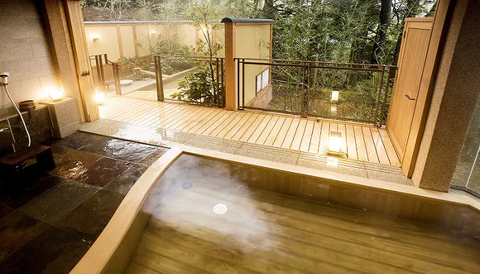 広々とした和の空間は、客室露天風呂につながる寝室のプライバシースペースと、客室係が出入りする和室ダイニングに分かれ、ゆったりと快適な時間を過ごすことができます。温泉は、大涌谷からの源泉を引き湯した掛け流しの天然温泉。肌触りの滑らかな白濁の湯には、硫黄成分を含みます。多くの政財界人や文学者も訪れたこの宿で、自然と温泉に癒されながら歴史に想いを馳せてみては。