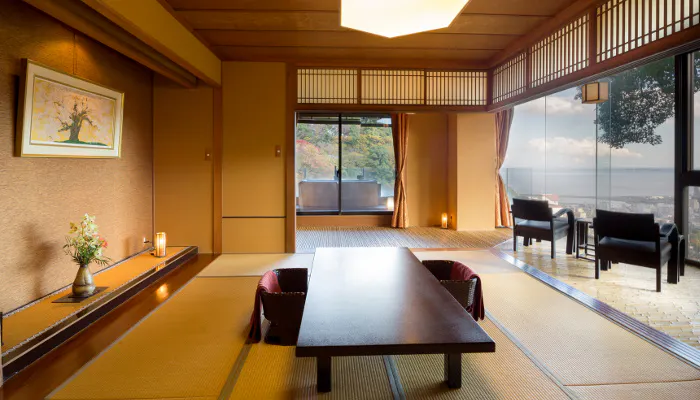 全客室のテラスには、趣が異なる専用の温泉露天風呂が。竹林に囲まれた湯船に身をゆだねれば、至福の休日に心が満たされていくようです。海と夜景を見下ろす絵画のような大パノラマを独り占めして、何もしない贅沢な時間を過ごす。まさに大人のおこもり旅ですね。
