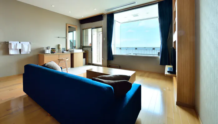 「和」と「和み」が共存した7室のお部屋は、どこか懐かしい和室や安らぎのベッドルームなど、ゆったりした時の流れを感じられる要素が満載。特に「きりつぼ」のお部屋は景観を満喫してほしいという思いから2面が窓になっていて、差し込む光とモダンな家具とのコントラストが印象的。食事もお部屋でのんびりいただきましょう。