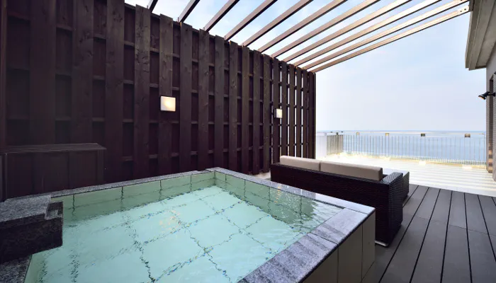 各お部屋に源泉かけ流しの半露天または露天風呂を備えますが、中でも「ナチュラルスイート」は室内と同じくらい広いテラスに露天風呂があり、その開放感は抜群。海風を全身に受けることができます。海に輝くサンロードやムーンロードが見えたら、自分だけが出会えた特別な景色に感じられそうですね。
