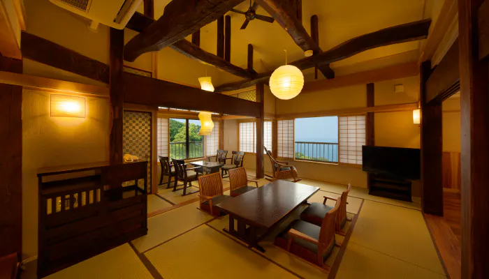 「南熱海網代山温泉 竹林庵みずの別邸」は新潟の古民家などを移築して造られた「竹林庵みずの」の別邸。まるで生きているかのような反りや跳ね返りのある14mの杉の梁、ケヤキの古材などを使用して建てられました。天井を見上げれば、その力強さと美しさにきっと目を奪われることでしょう。