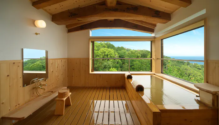 お部屋からは海と山を見渡せますが、客室露天風呂からのビューも絶景。晴れてよく澄んだ午後には、房総半島や初島も望めるそう。木の枕に寄りかかりながらの湯浴みは、目の前の自然と一体になったかのようなリラックス感を得られるでしょう。お湯は源泉かけ流しで、24時間いつでも利用可能です。