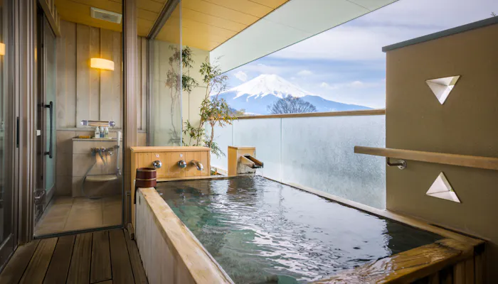 「露天風呂 富士山」は、深さの異なる3段の湯船でゆったりと温泉に浸かりながらパノラマの景色を満喫できる、宿で一番の絶景スポット。最も深い深湯では立ち膝で、最上段の寝湯では横になって、富士の名湯と富士山のある景色を楽しみましょう。