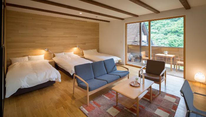 雪深い越後湯沢温泉の豊かな自然を活かした「里山十帖」。日本の原風景を思わせる里山の光景に、どこか懐かしさを感じることでしょう。北欧家具が配された館内は、木目調の設えが心落ち着く雰囲気を醸し出します。“クリエイターが長期滞在できる部屋”など、テーマに沿った室内は遊び心が満載。開放的な露天風呂では“巻機山”を中心とした2,000m級の山々を望みながら湯浴みを堪能しましょう。どこまでも続く雄大な景色に、思わず深呼吸をしたくなりますね。
