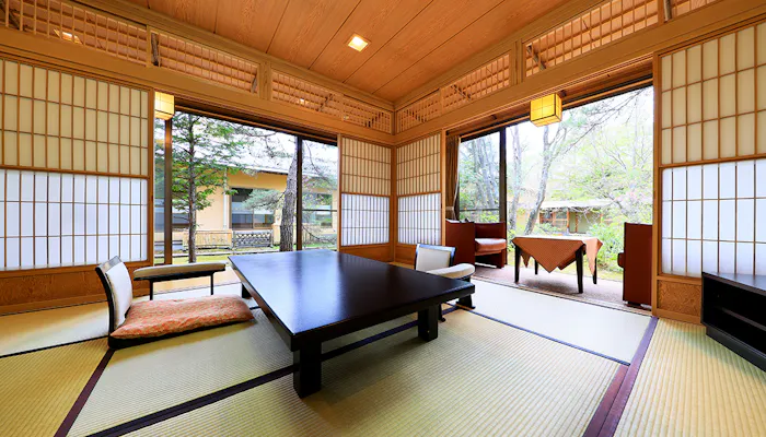 客室は、洋室に日本の伝統工芸を散りばめた「コンフォートフロア」や、和モダンの「泉游亭」など全36室。「【泉游亭・みねざくら】」は、宿で唯一窓から「湯畑」を望む、眺望自慢のお部屋です。