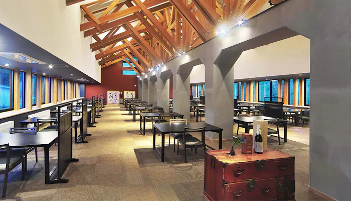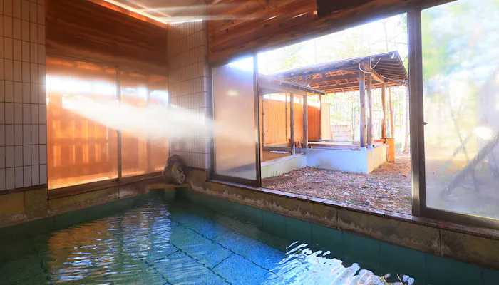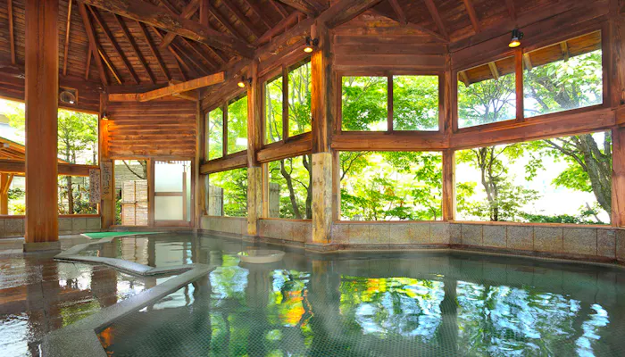 大浴場「うららの湯」には御影石の内湯と檜の露天風呂の2つの湯船があり、万代鉱源泉から引き入れた湯がたっぷりと注がれています。広大な自然林に囲まれた露天風呂は開放感抜群。緑が美しい春夏、葉が鮮やかに色付く秋、雪見風呂も楽しめる冬と、季節毎の風情を名湯とともに堪能してみては。