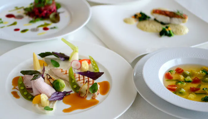 瑠璃色の海がどこまでも続く部瀬名岬に位置する「ザ・テラスクラブ ウェルネスタラソ アット ブセナ」は、“健やかなライフスタイル”を提案するウェルネスなリゾートホテル。夕食には沖縄の食材を、ヘルシーな調理方で仕上げた「ウェルネスキュイジーヌ」で体の内側から健康になりましょう。グルマンな方には「simaキュイジーヌ」がおすすめ。自分の好みに合わせて選んでみて。