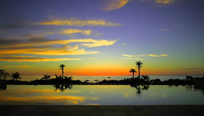 アネックス棟にある屋外プールは、最上階ならではの感が心地よいインフィニティプール。一番奥に置かれたデッキチェアに腰を掛ければ、プールと海が一直線に見え、まるで海に溶け込んだような感覚になります。刻一刻と変わりゆく景色は、ずっと眺めていても飽き足りないほど神秘的な光景。夜には水面がライトアップされ、ムードも満点です。