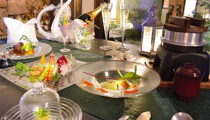 夕食は、自家菜園で育てた50種類以上の野菜をふんだんに使った「やさいイタリアン」のコース。繊細さと美しさが溢れたお料理は、思わず写真に収めたくなってしまうでしょう。お料理が魅力の「オーベルジュ」だからこそ味わえる時間を堪能してみませんか。