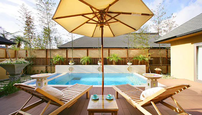 広大なヴィラで、ひときわ存在感を放つのがプライベートプールです。日本の落ち着いた雰囲気と、アジアンリゾートの雰囲気が融合したお部屋は、日本にいながらも海外気分を贅沢に堪能させてくれます。自由な食事スタイルができるのも魅力の一つ。ルームサービスで極上のプライベート空間を味わうのも優雅でしょう。